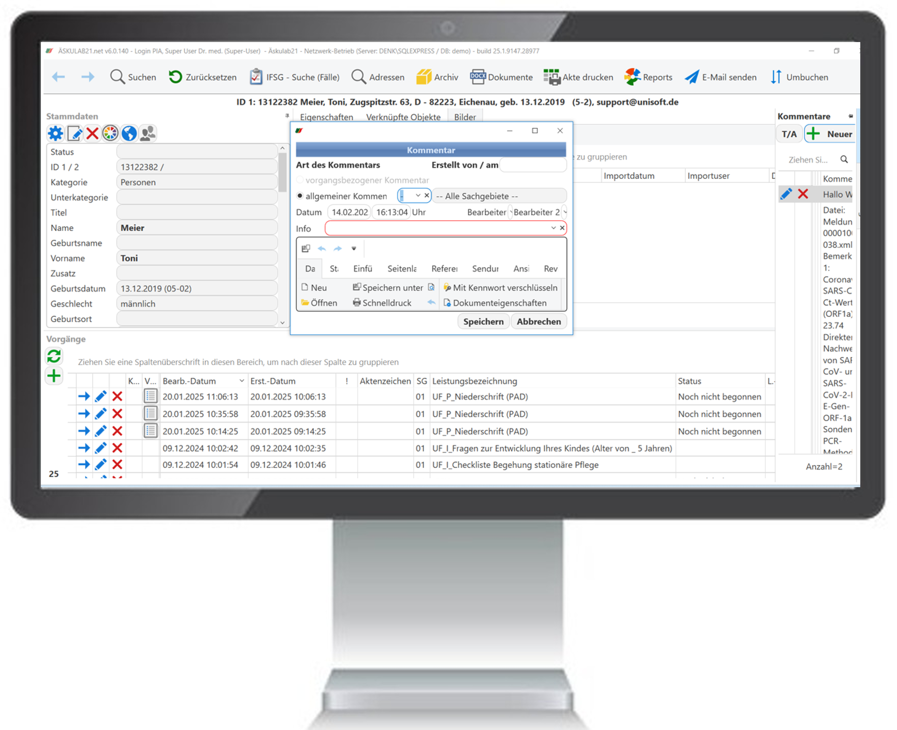 Das Modul "Jugendärztlicher Dienst" dokumentiert umfassend Einschulungsuntersuchungen an Kindern. Spezifische Erfassungsmasken für bundeslandspezifische Untersuchungsmethoden sind verfügbar.